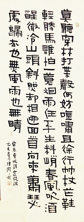 陈冉冉,自由书法篆刻人,籍浙江金华,字允灏,署紫墨阁主,幼承家学,于秦汉碑帖深有研究,尤擅于摩崖书法,篆刻刀风酣畅淋漓,于章法布局多有建树,早先曾遍临汉碑多年,鲜有创作,根基深厚,创作后首作隶书“沁园春雪”即被选入地区展览,后蒙职业书法篆刻人朱恒永先生悉心指点,执弟子礼,作品几可乱真。再拜地方名家陈联芳先生,勤加炼习,数年如一日,挥毫耍刀于书斋,近年时有创作,皆为识者藏之。