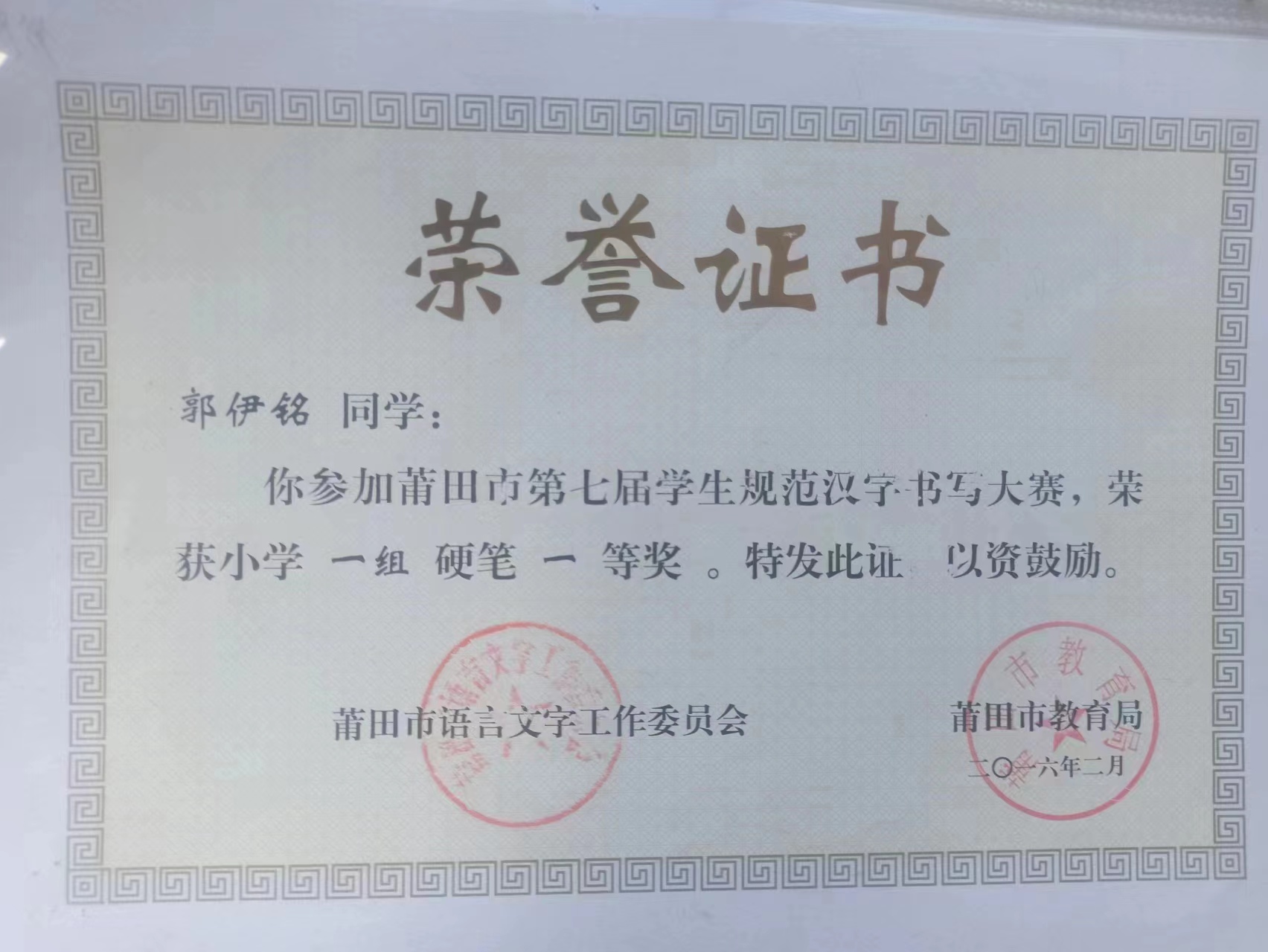 2016年2月获得莆田市第七届学生规范汉字书写大赛硬笔一等奖;