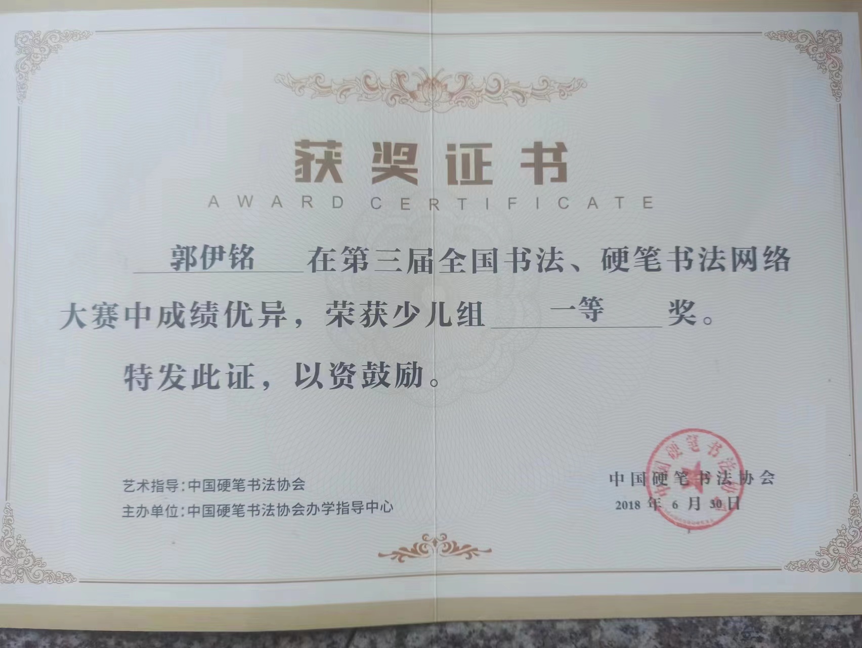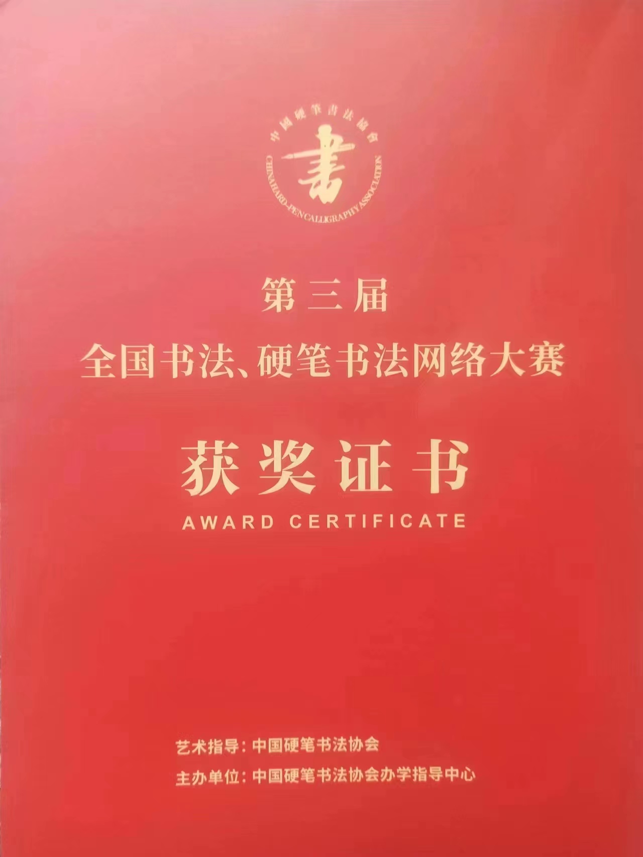2018年6月获得第三届全国书法、硬笔书法网络大赛一等奖。
