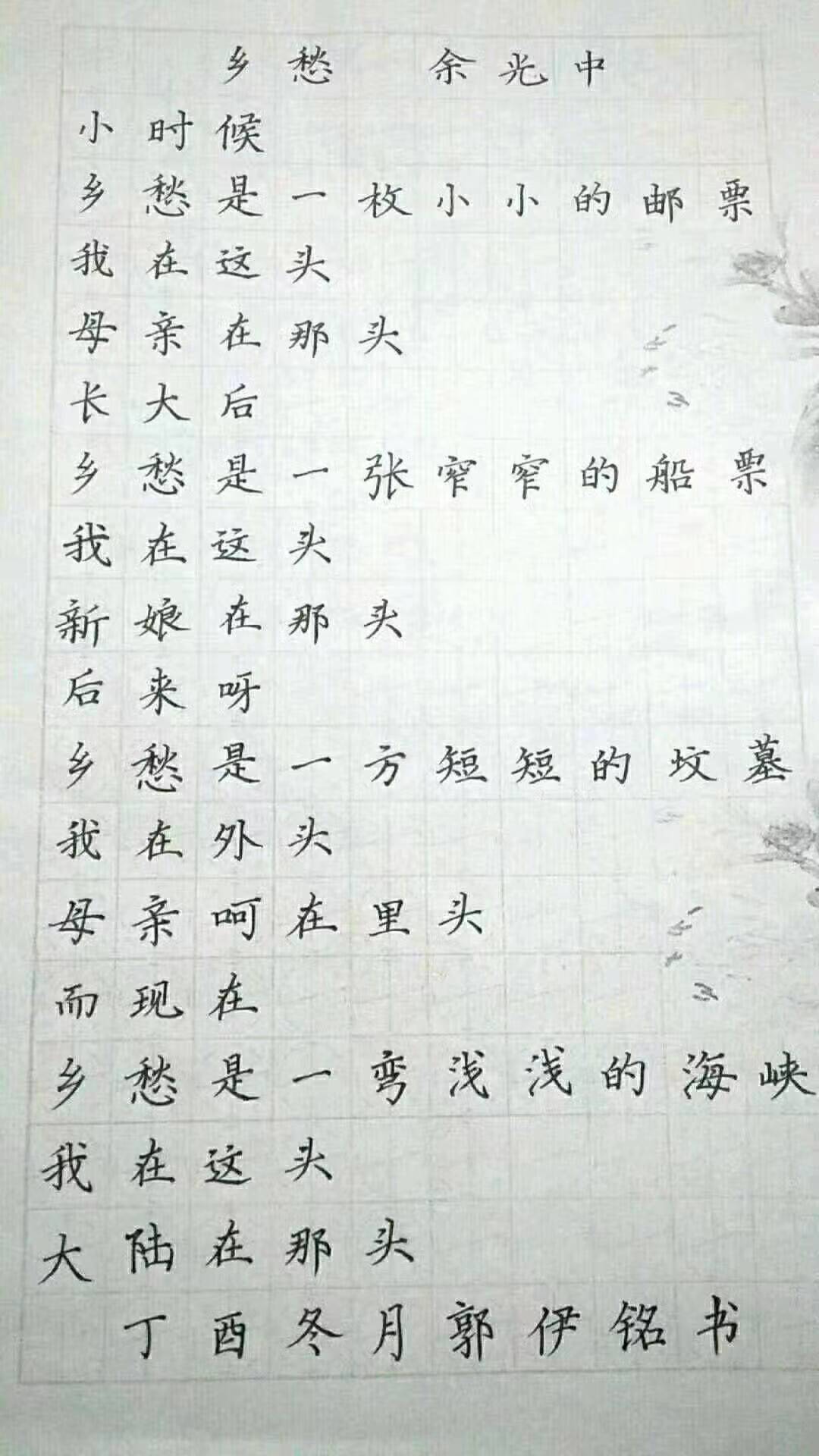 郭伊铭,女,回族。2006年11月出生于福建省莆田市仙游县一个普通农村家庭。她从小热爱学习酷爱书法。2013年就读于鲤南中心小学,在小学六年期间以优异的成绩,在校获得多项奖状,参加了多次县、市书法比赛,出版了学校鲤韵月报。2019年8月被仙游第一中学省一级达标校破格特招,三年初中生涯不负老师的辛勤教导,2022年8月再次被仙游一中高中部录取。 在研习学习书法期间,曾得到著名国礼艺术家王静秋老师的培养和指导。在王静秋老师的鼓励下, 曾应邀参加全国各种文化艺术交流和书法比赛。近年来获得的书法与各项比赛获奖如下: