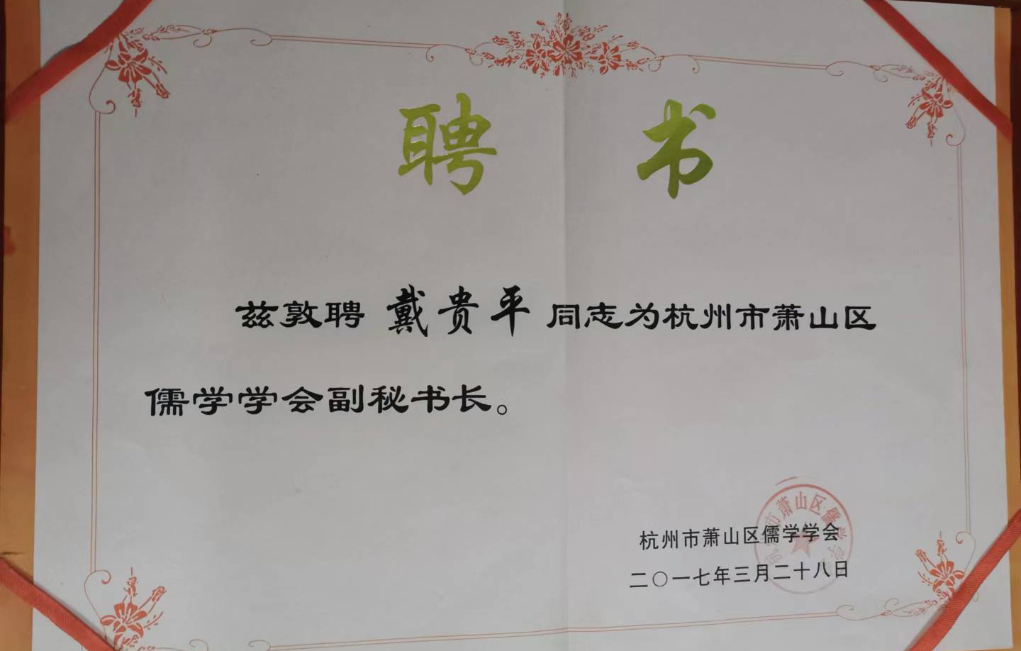 杭州市萧山区儒学协会副会长,