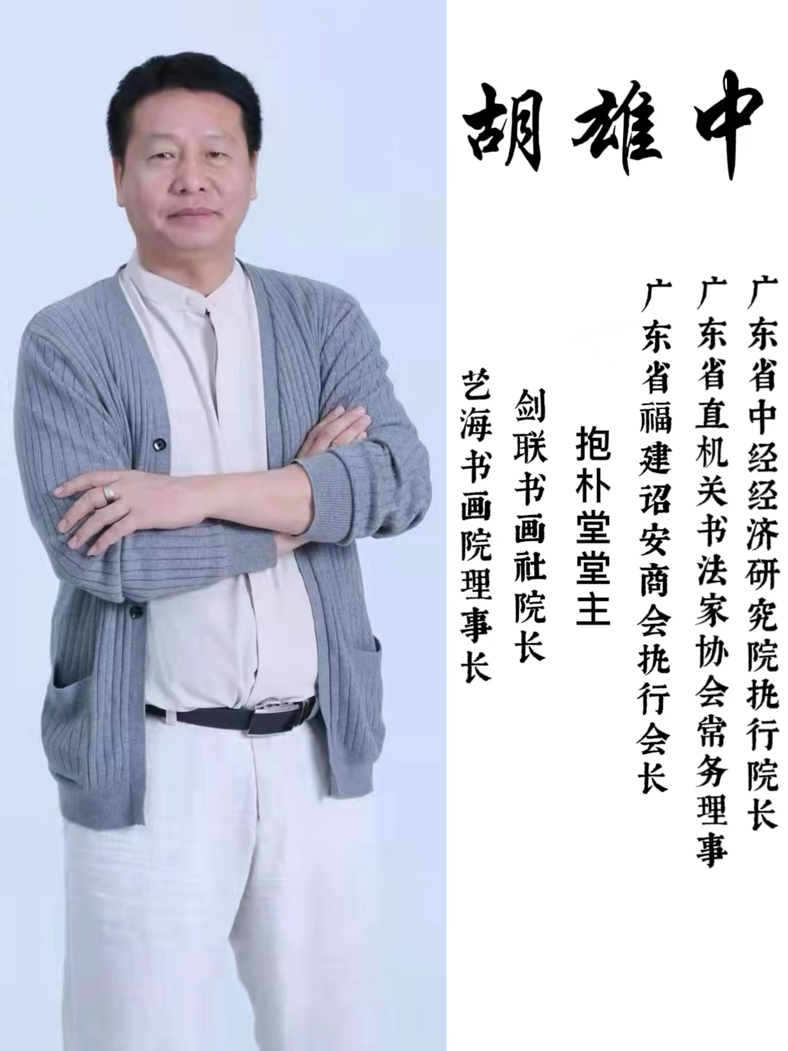 胡雄中,现为广东省直机关书法家协会常务理事,岭南艺海书画院理事长,剑联书画社会长,艺缘阁书画会顾问,抱朴堂堂主。