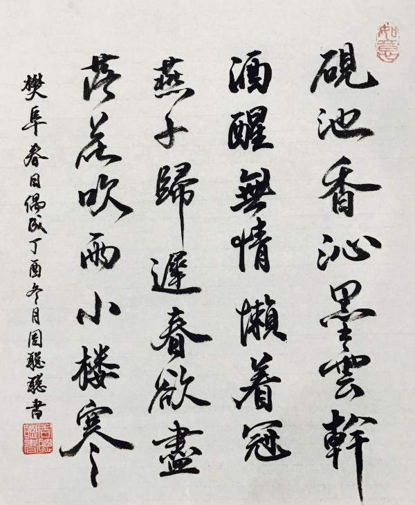 偶然间提起毛笔,“毫虽轻,功甚重”的想法随之而来,并且狂爱一发不可收拾,提笔练字常常忘我至凌晨。频繁游览参观各种书画展览;和各大书画前辈学习和探讨交流。 常提字书写祝福语在婚礼上赠予新人。常被评价“虽是姑娘家,字迹却是男孩儿范”。