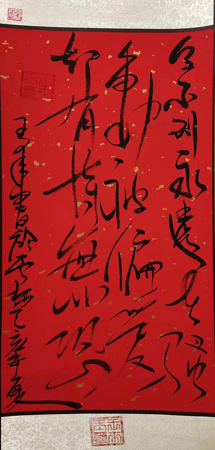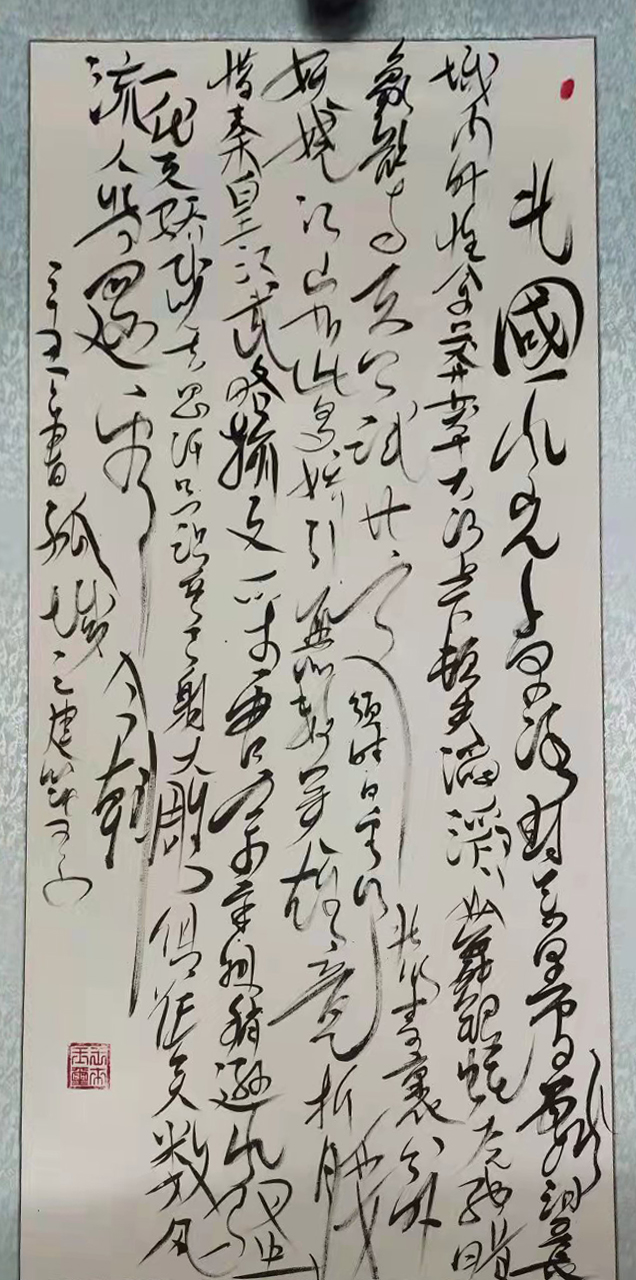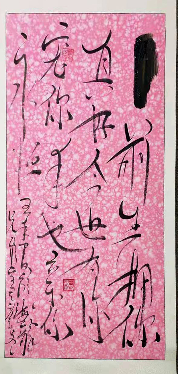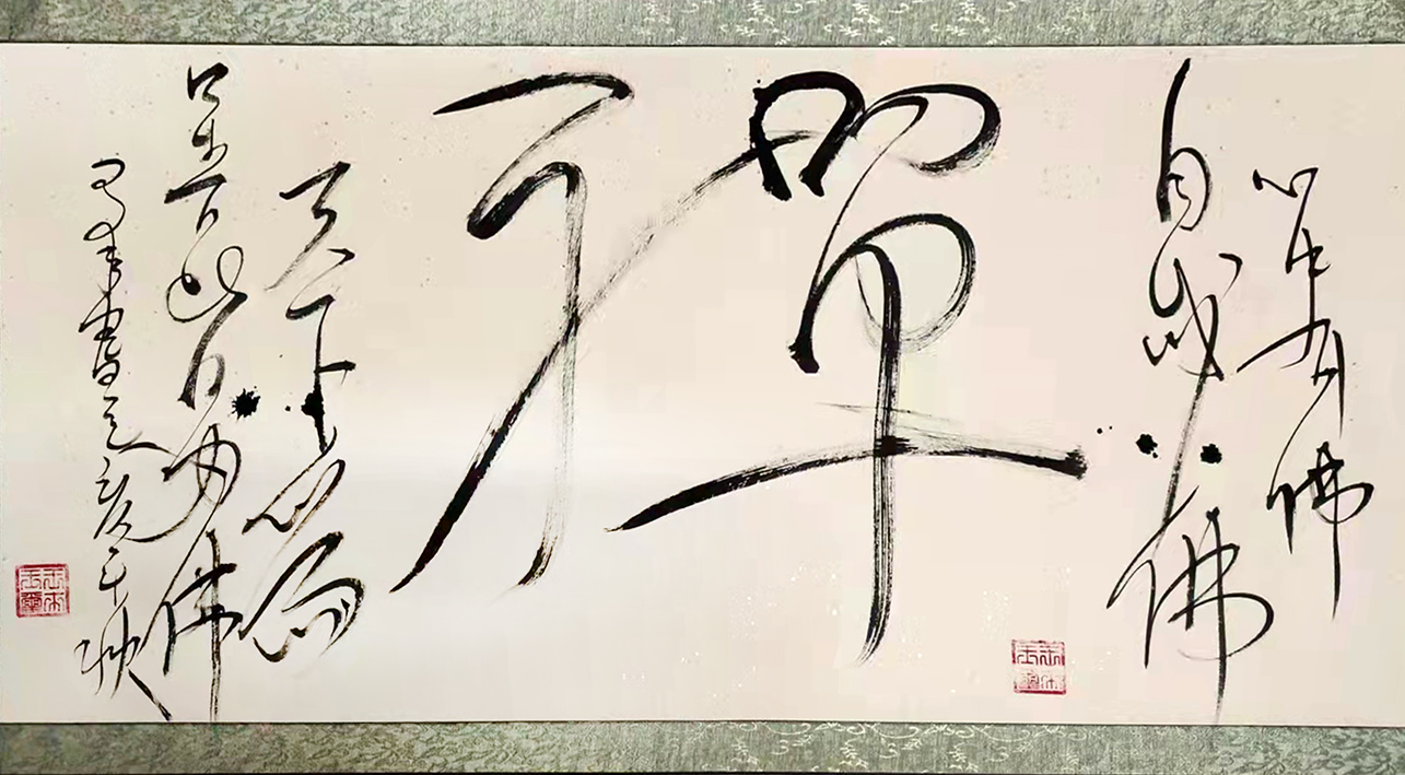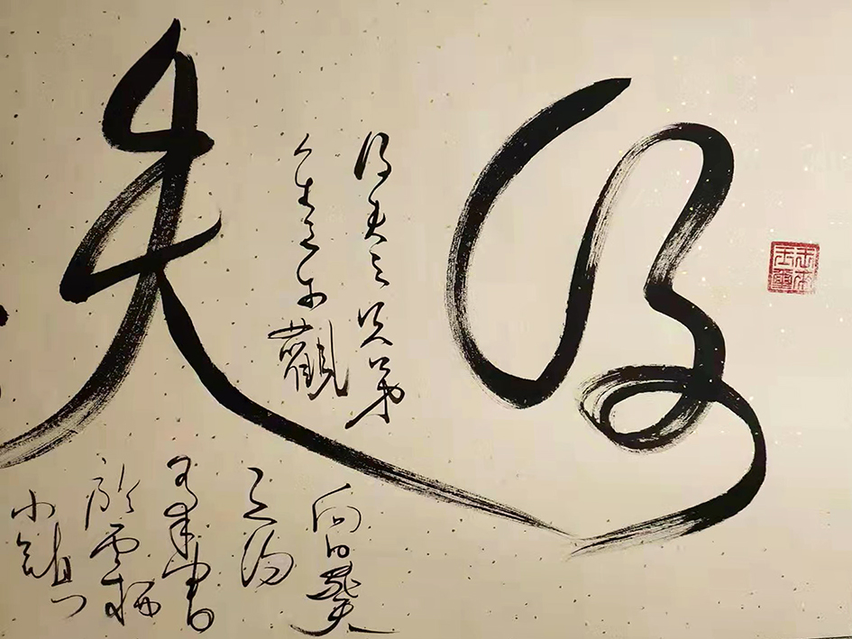提笔时,拿壶酒与墨对饮。将字与身心结合,做到忘我境界。笔尖行云流水,一蹴而就。