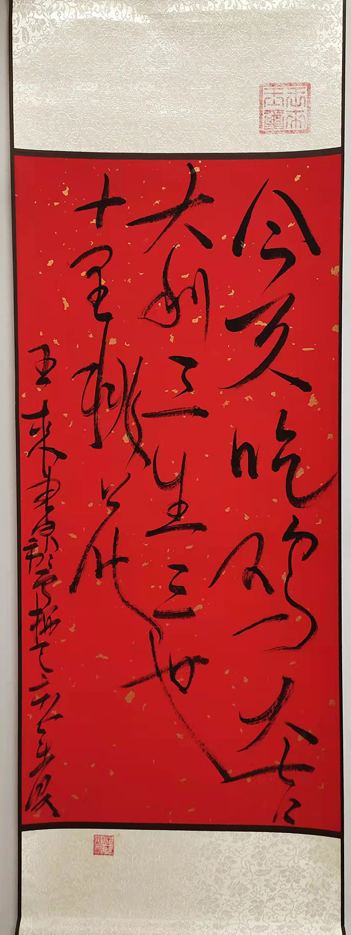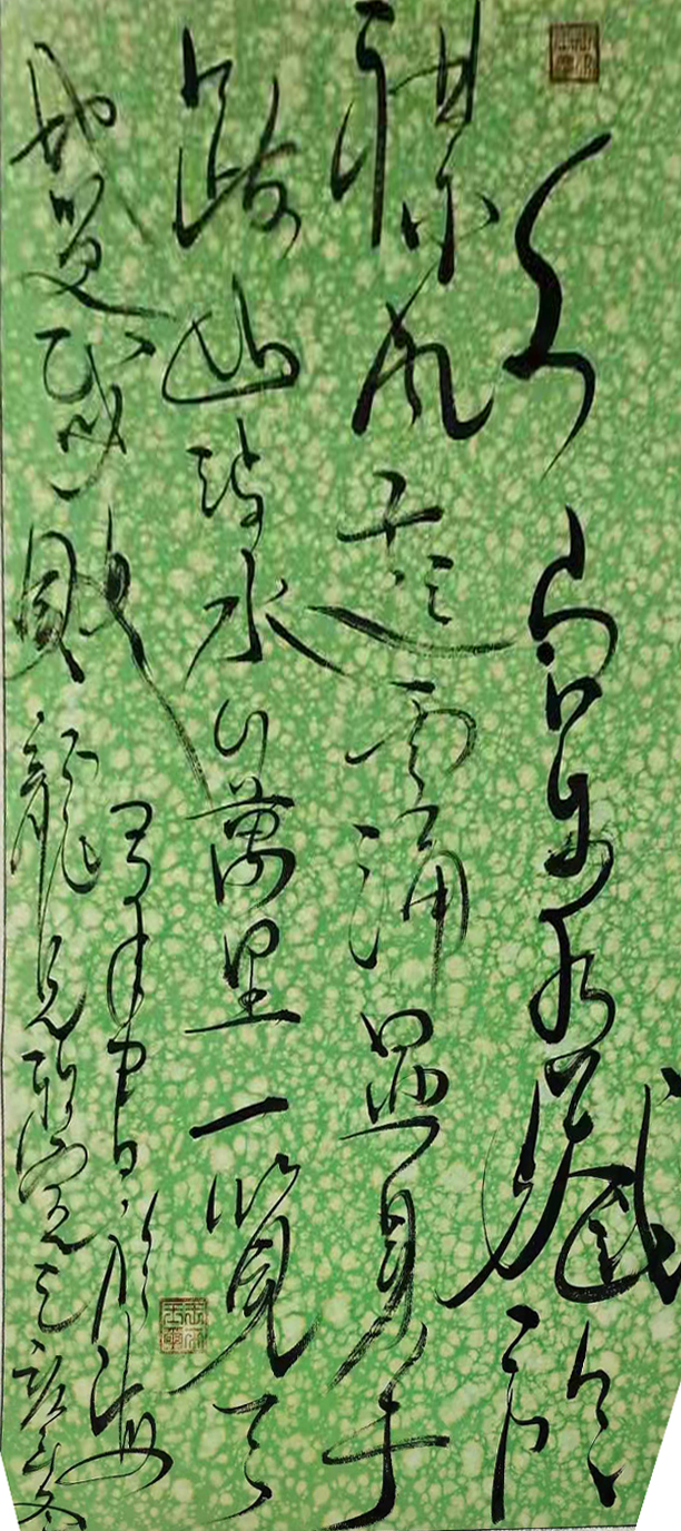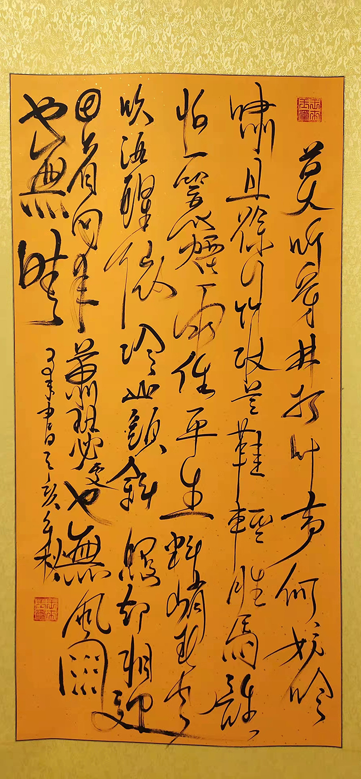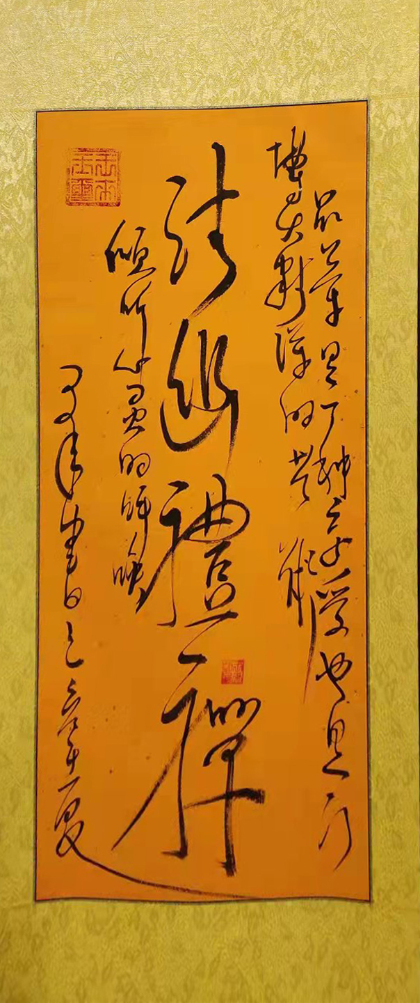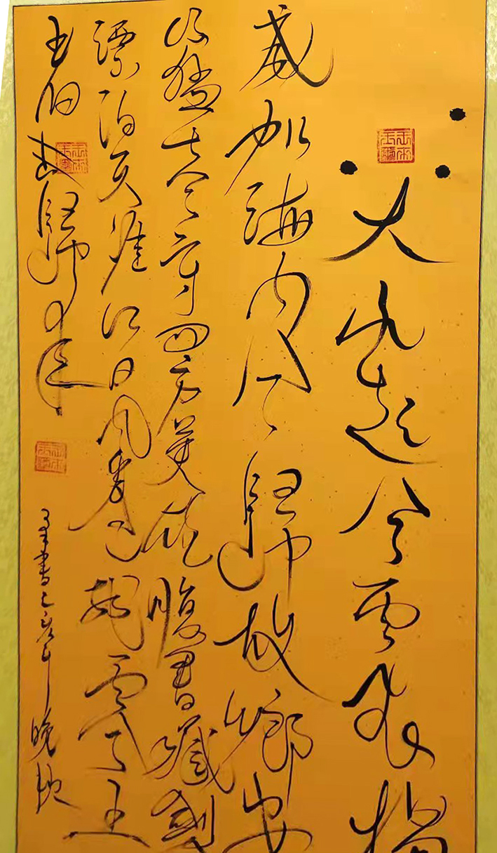 提笔时,拿壶酒与墨对饮。将字与身心结合,做到忘我境界。笔尖行云流水,一蹴而就。