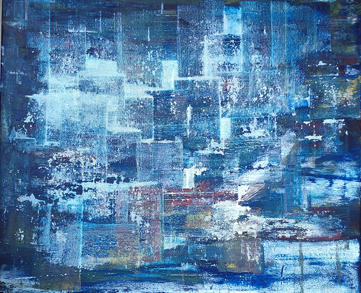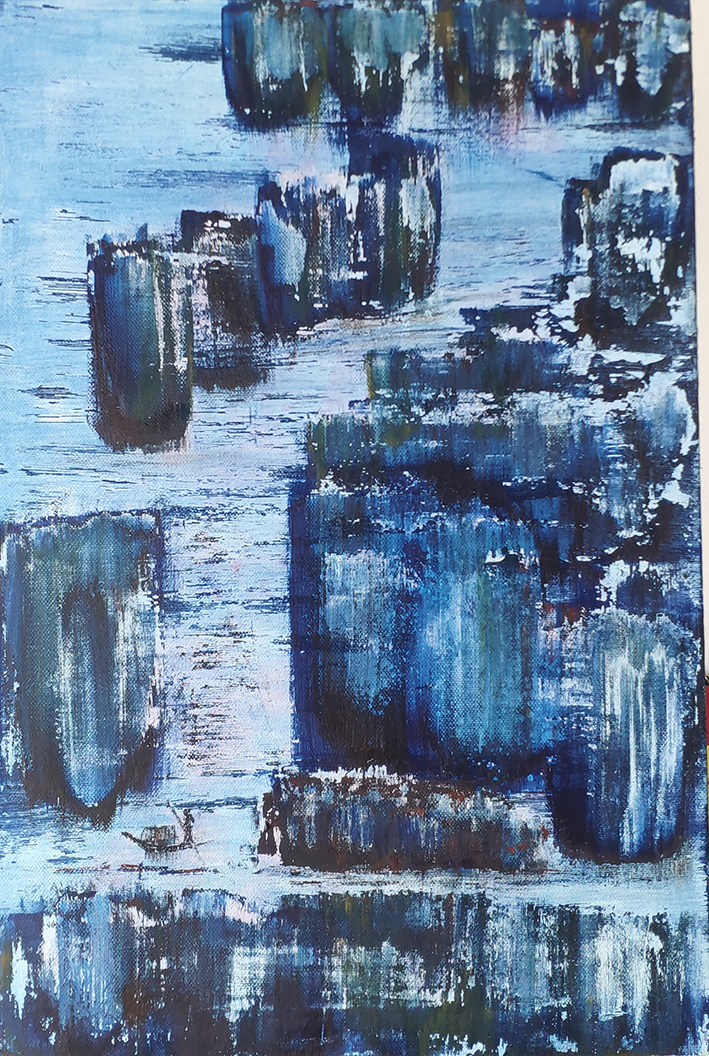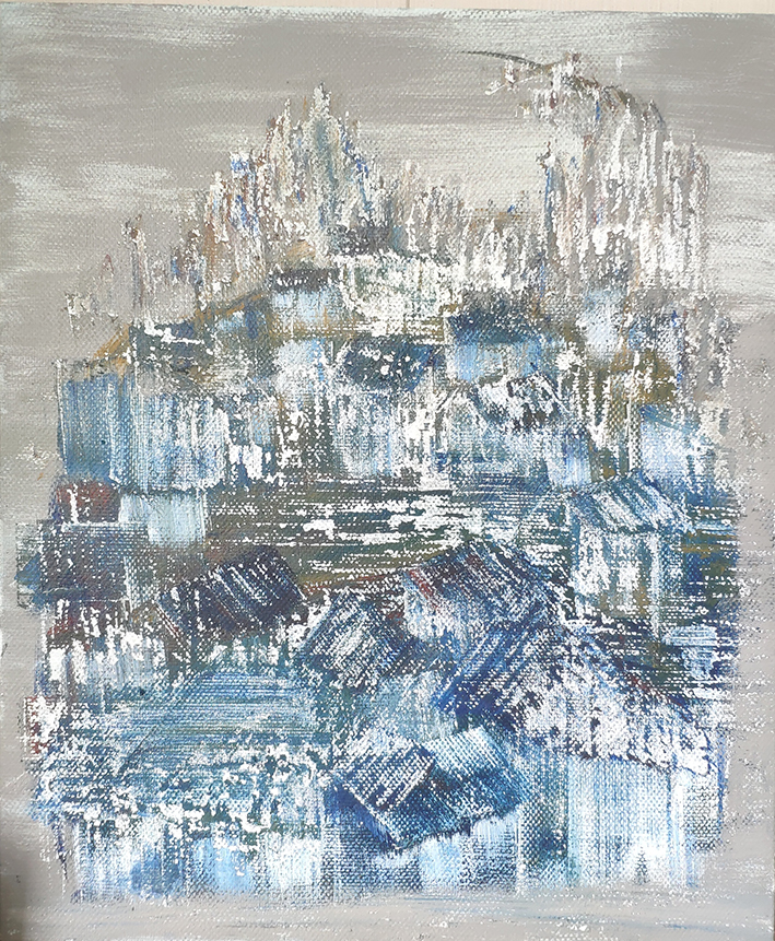 油画:离岸,她把多个影像重叠,像在窗前,望着暮色里的岸边,人们的各自姿态、表情,她本想用一首诗来表达: