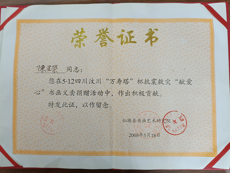 2008年5月18日由福建省仙游县书画艺术研究院举办的四川汶川5.12‘‘万寿塔’’杯抗震救灾献爱心书画义卖捐献活动中,作出积极贡献,把义卖捐献的73万元人民币由民政局糸统全部送往灾区,所有作品受到书画爱好者们的追捧。