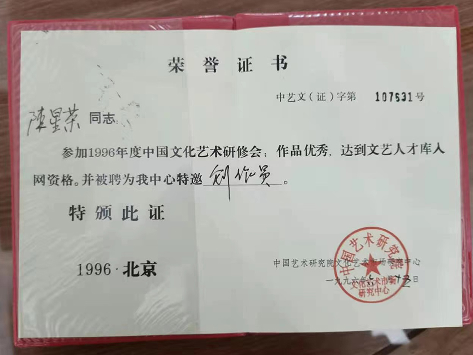 1996年6月参加中国文化艺术研修会,作品达到文艺人才库入网资格,被聘为特邀创作员。