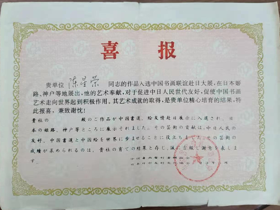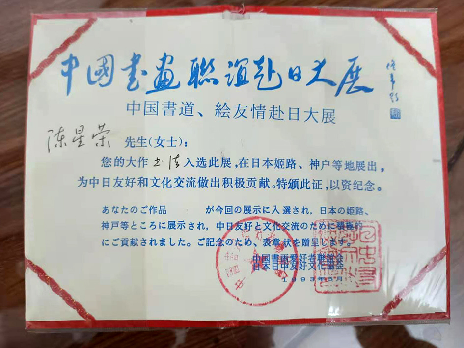 1993年5月书法作品由中国书画联谊赴日大展主办在日本姬路、神户等地展出,为中日友好和文化交流做出积极贡献。