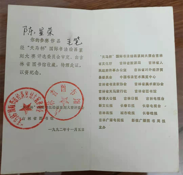 1992年11月书法作品经‘‘天马杯’’国际书画篆刻大赛评选委员会审定,由吉林省图书馆收藏。