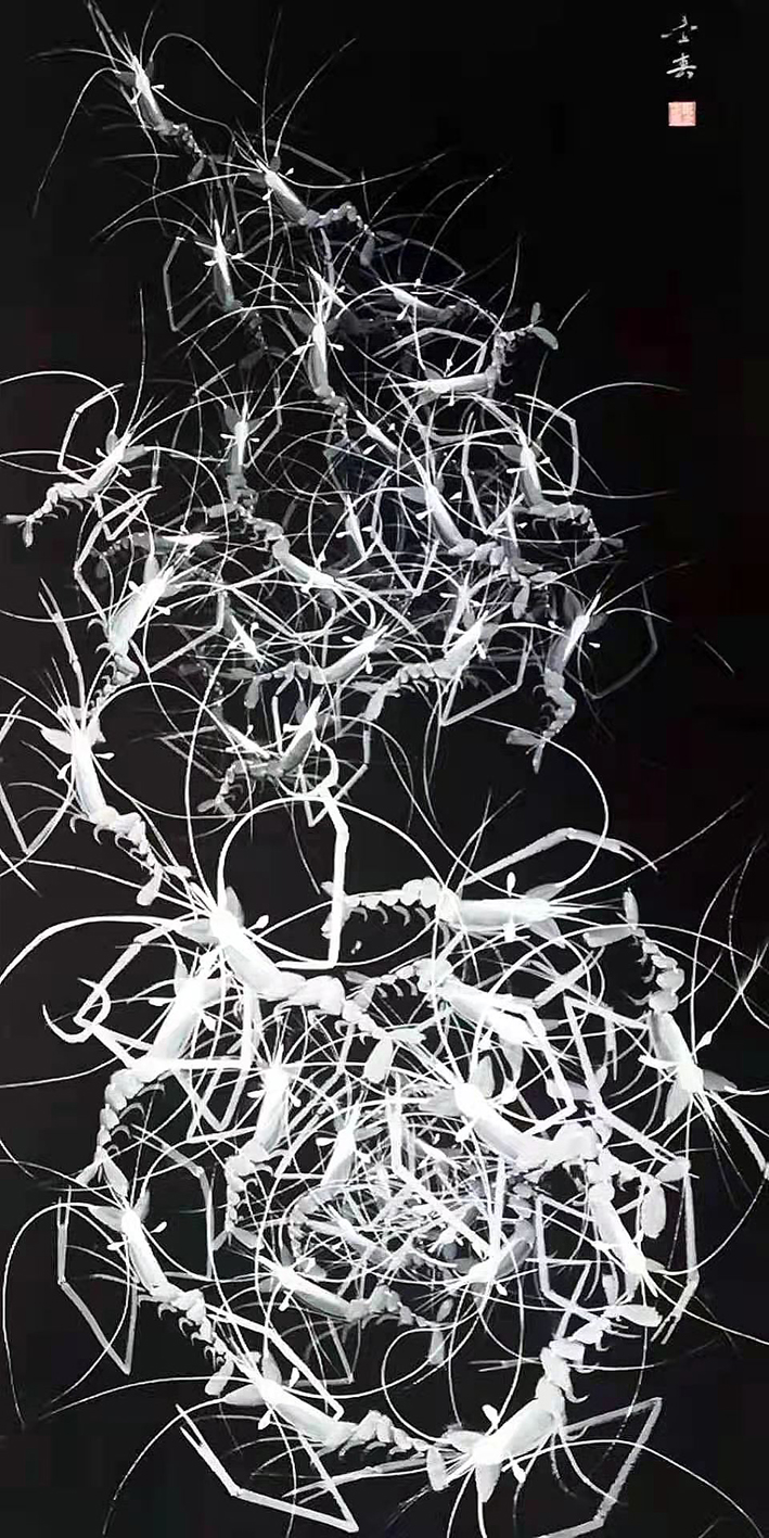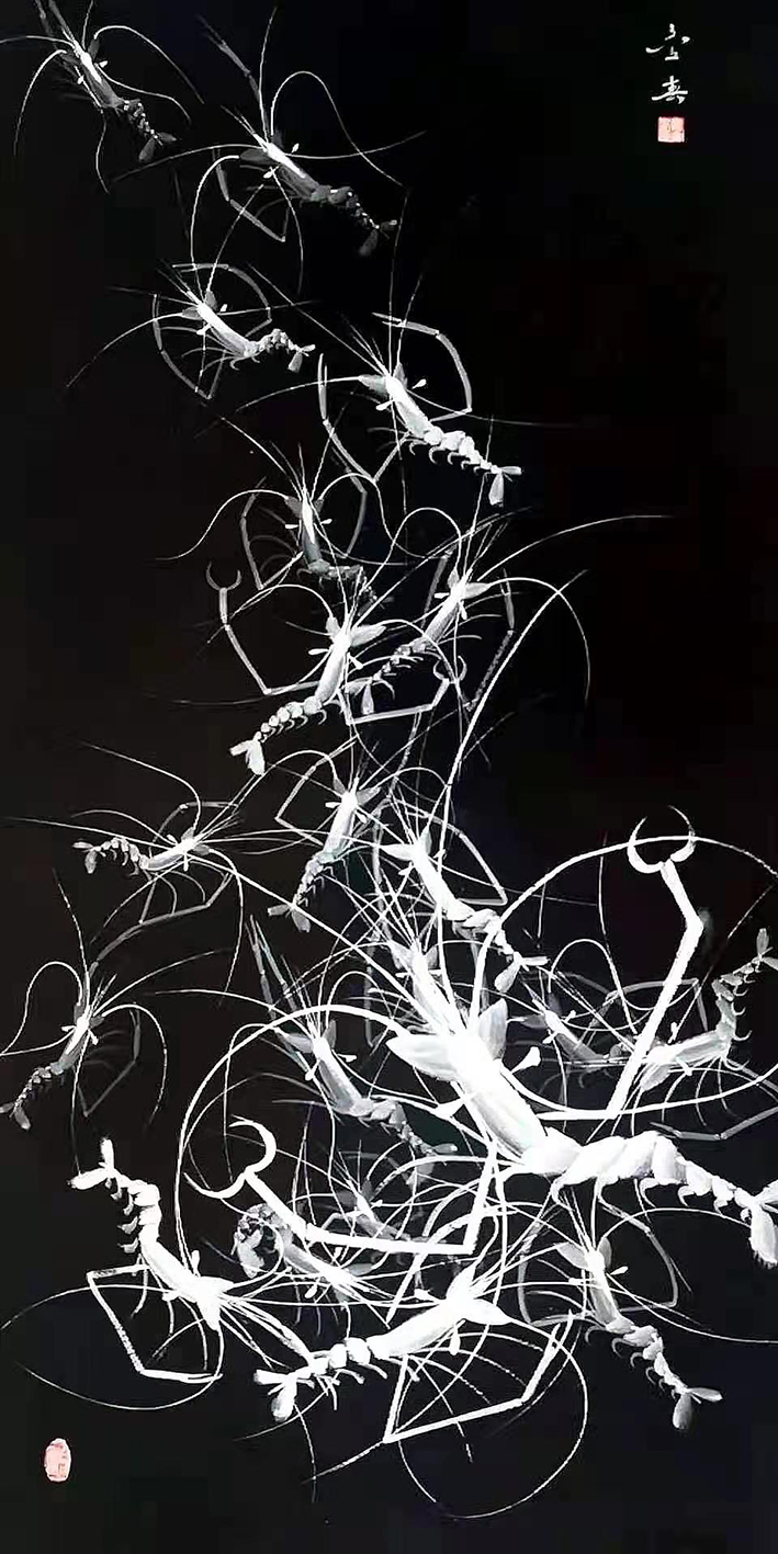 自幼酷爱齐白石先生画的虾,他认为虾是弱小群体,能屈能伸,勇敢生存,是一种坚强的象征。虾晶莹剔透,清清白白,品性高洁。虾身节节相连,蕴含年年好,节节高。他认为虾是小龙,龙是吉祥物,是中华民族的象征。因此,他潜心画虾二十年,专工精炼几万幅,终于春华秋实,修成正果。他在国内首创的巨幅画作命名为“吉祥巨虾”,其创新代表性作品《吉祥巨虾图》入选大世界吉尼斯纪录。