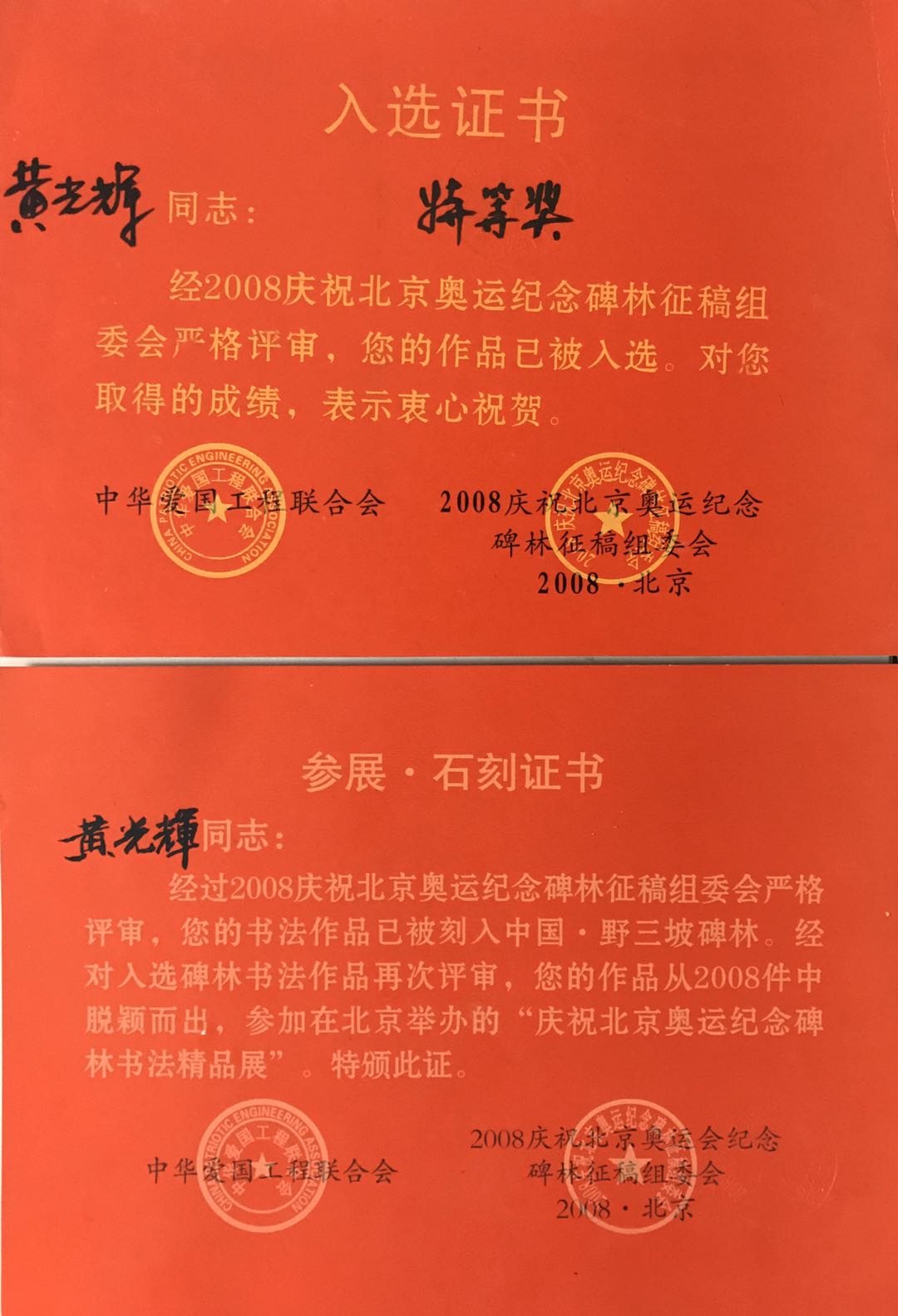 2008年庆祝北京奥运纪念碑林全国书法大赛,书法作品荣获全国特等奖,并被组委会收藏,现刻于中国河北省野山坡碑林。