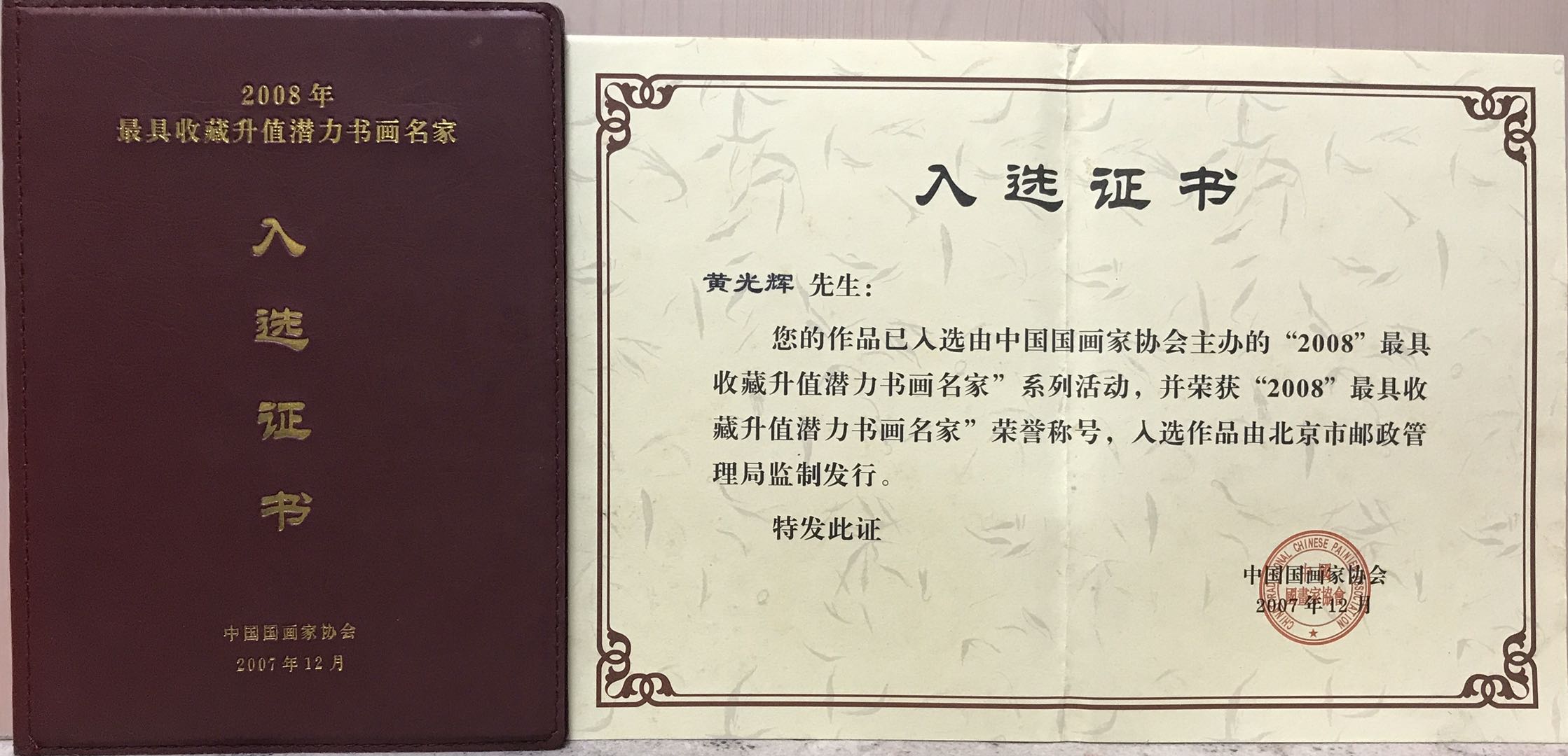 2008年经中国国画家协会专家组评审:荣获2008年“当代最具收藏升值潜力书画名家”荣誉称号。入选作品由中国国际艺术出版社出版,并由北京市邮政管理局监制发行。