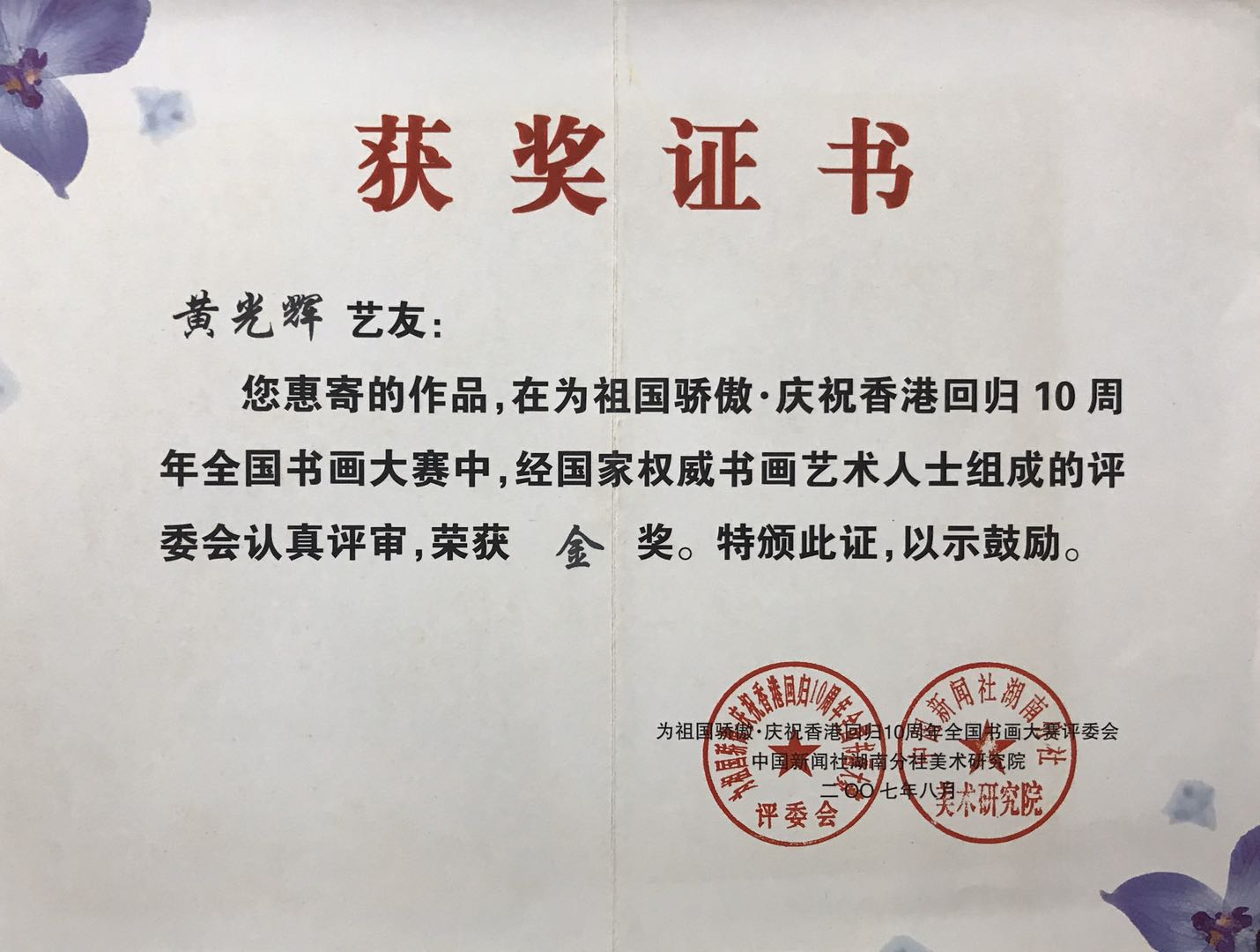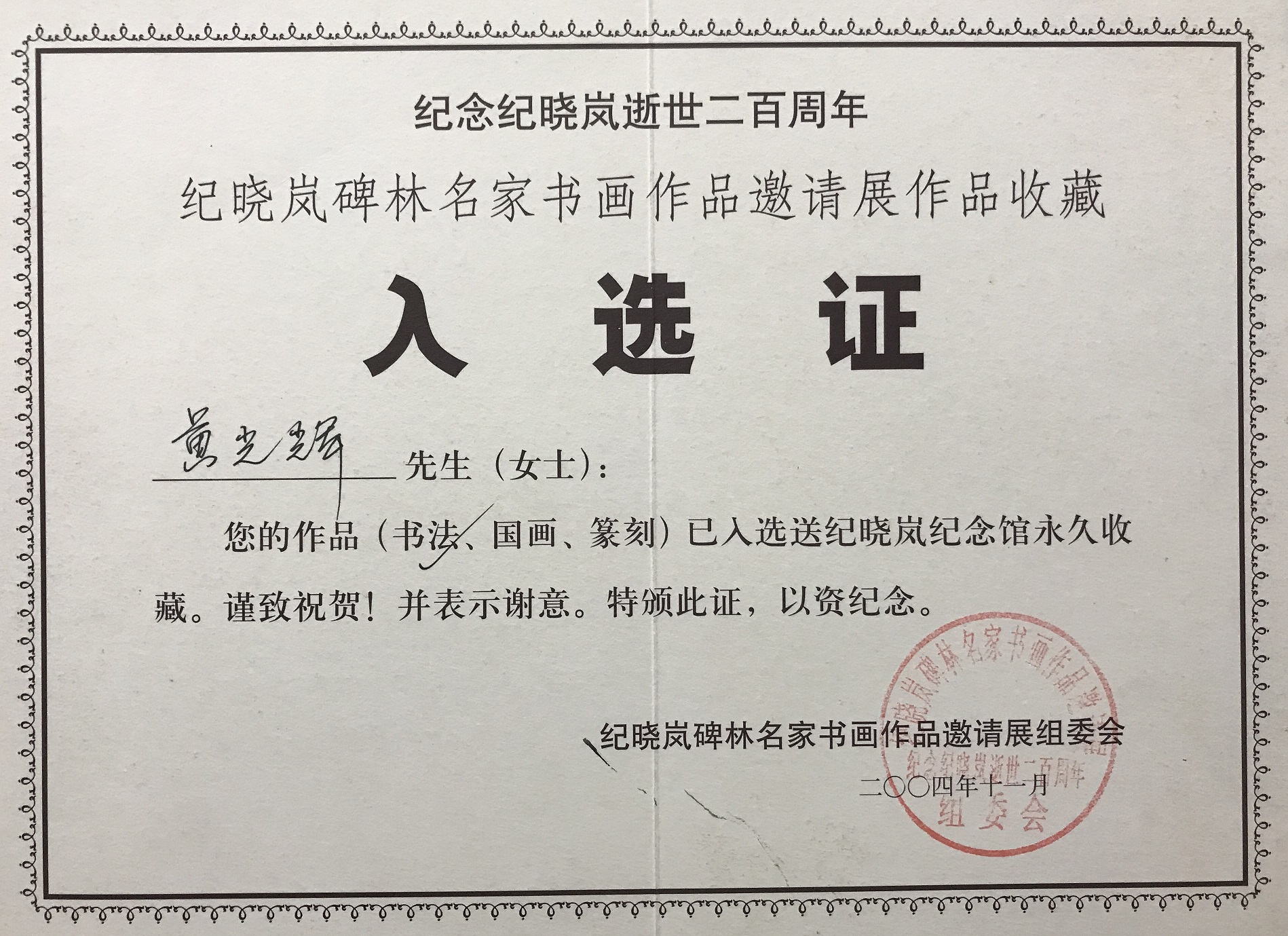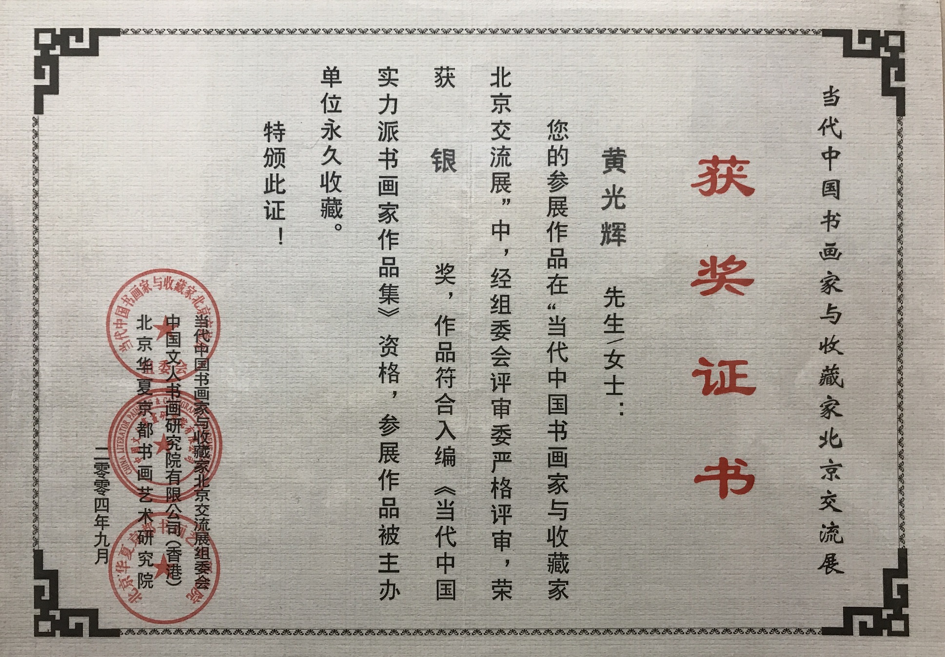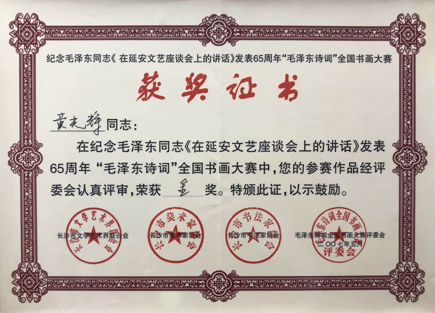 2005年由中国书画家联谊会专家组评审:获得“百名中国书画名家”荣誉称号。