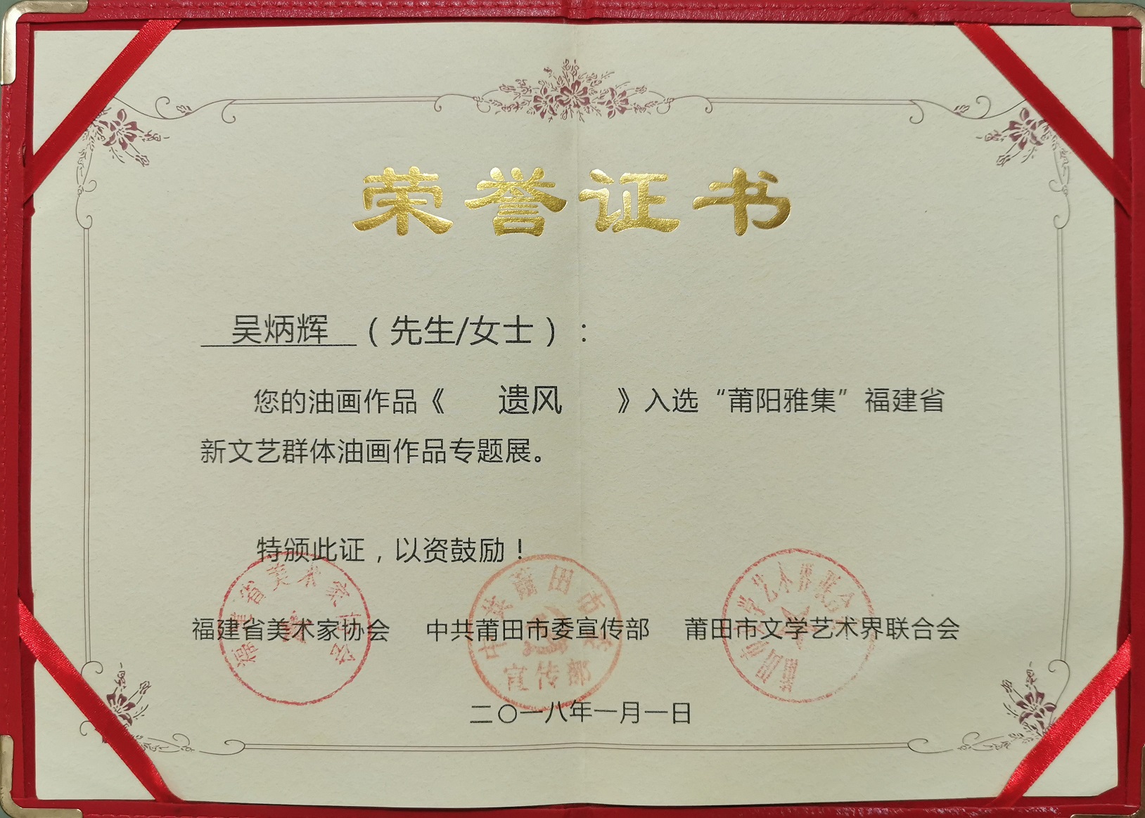 2018年1月 作品《遗风》入选“莆阳雅集”福建省新文艺群体油画作品专题展。