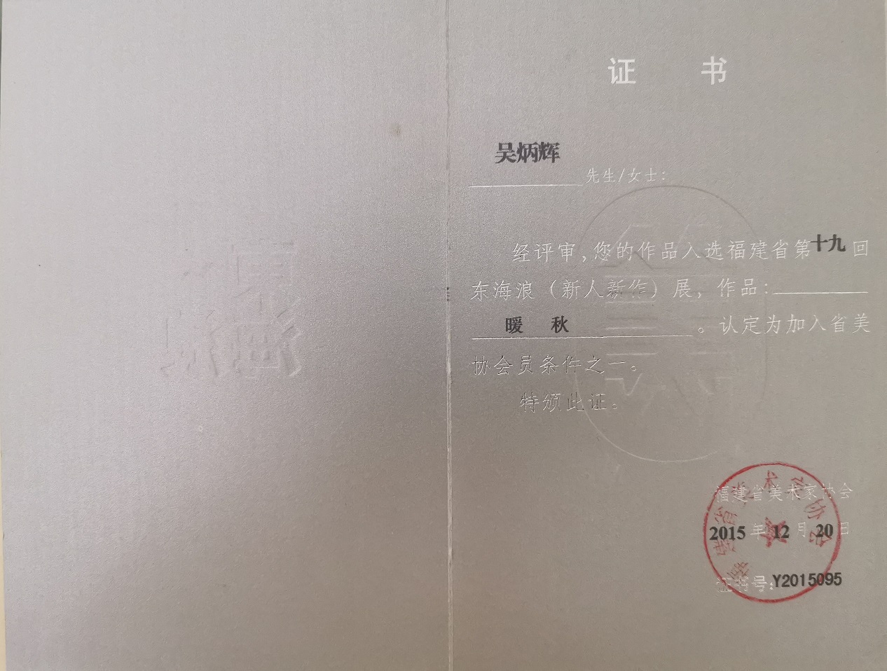 2015年12月 作品《暖秋》入选福建省第十九回东海浪(新人新作)展。