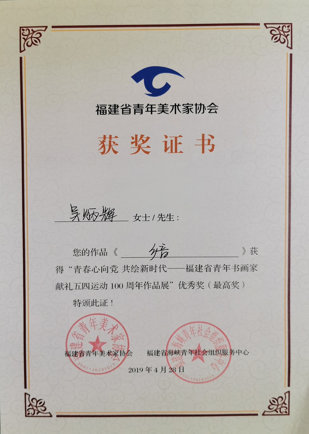 2019年4月 作品《乡音》获“青春心向党 共绘新时代——福建省青年书画家献礼五四运动100周年作品展”优秀奖(最高奖)。