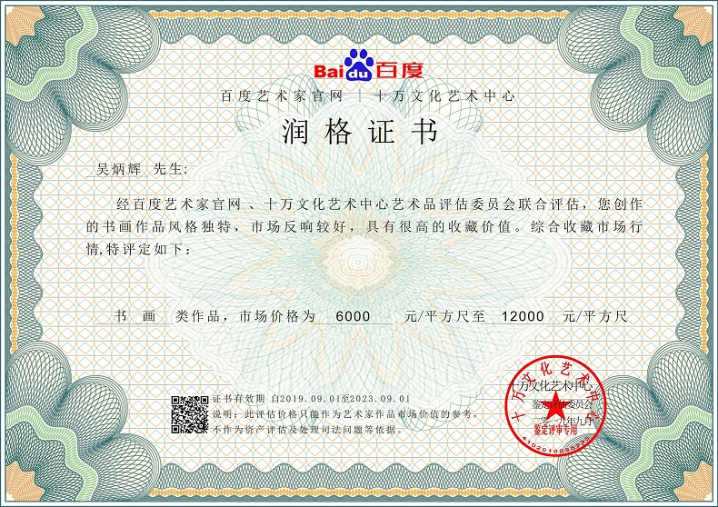 吴炳辉,职业画家,国家一级美术师,艺名“吴极”,号“渡一”。师从:张立平、赵九杰、孙建平、麻显钢、王琨、汪德龙老师。