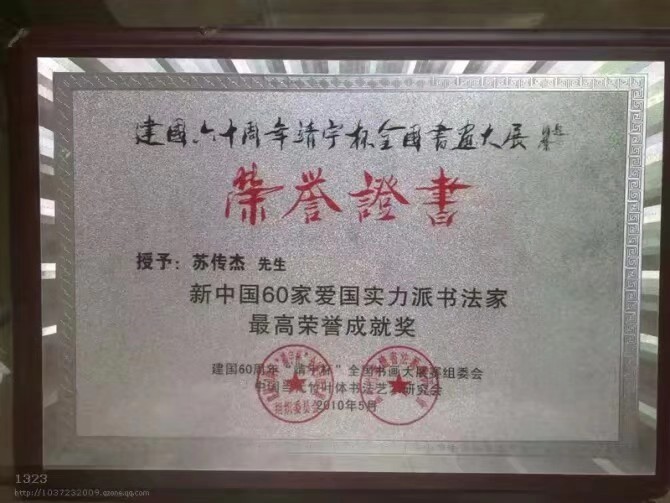2010年荣获"靖宇杯"全国书画大展授予爱国实力派书法家最高荣誉成就奖。