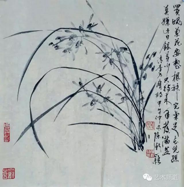 创作兰花,且忌描、涂、抹。从陈新颖创作兰花时看,他能把笔中之力,藏于腕中,使之有“力透纸背”之感。凡作兰蕙,要注重用笔有质感,刚柔相济,是为妙法。陈新颖把握写兰技巧,用笔扎实,画面厚重,浑然一体,使线条有美感,虽有轻飘之意,但不失质感之规,是其用笔之妙处。