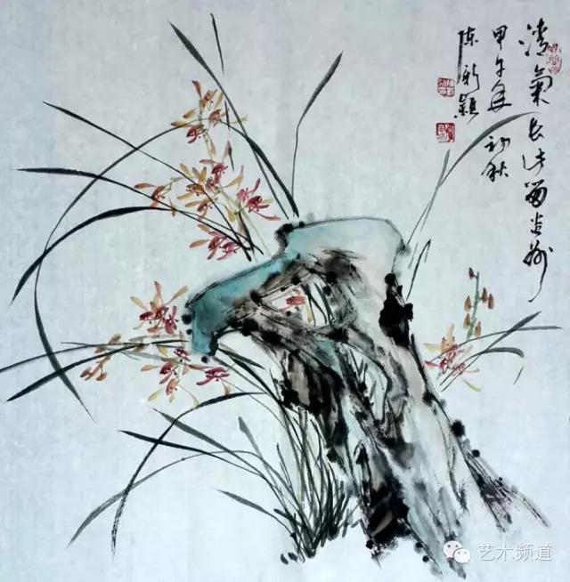 凡写兰用色协调,观有韵味者,乃为上品。写兰秀气,色彩娇嫩,宜用淡墨。如着色彩,亦应以淡雅为宜。余观陈新颖所作兰蕙图,用色协调,干湿润达。表现所创作兰花,有润泽之美。兰叶飘逸,兰花灵活,生气勃勃,是用色所为矣。兰花是四君子之一,内容丰富,品种繁多,特点不一,不管是兰叶长短宽窄,在用笔中要有所差别;不管是兰花的浓淡稀疏,用色冷暖,最为关键的是色调协调,在此基础上,再求兰花艳丽。