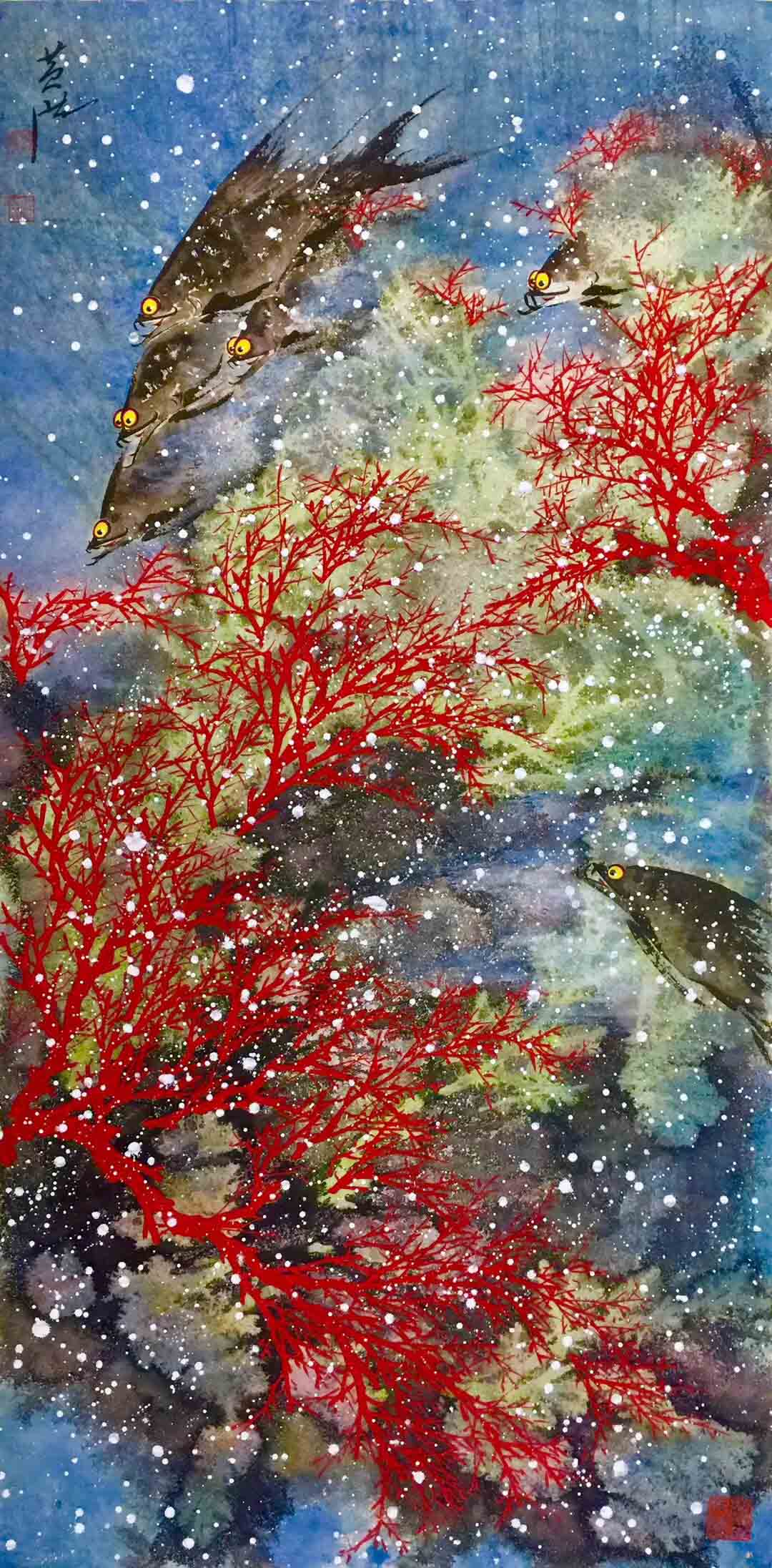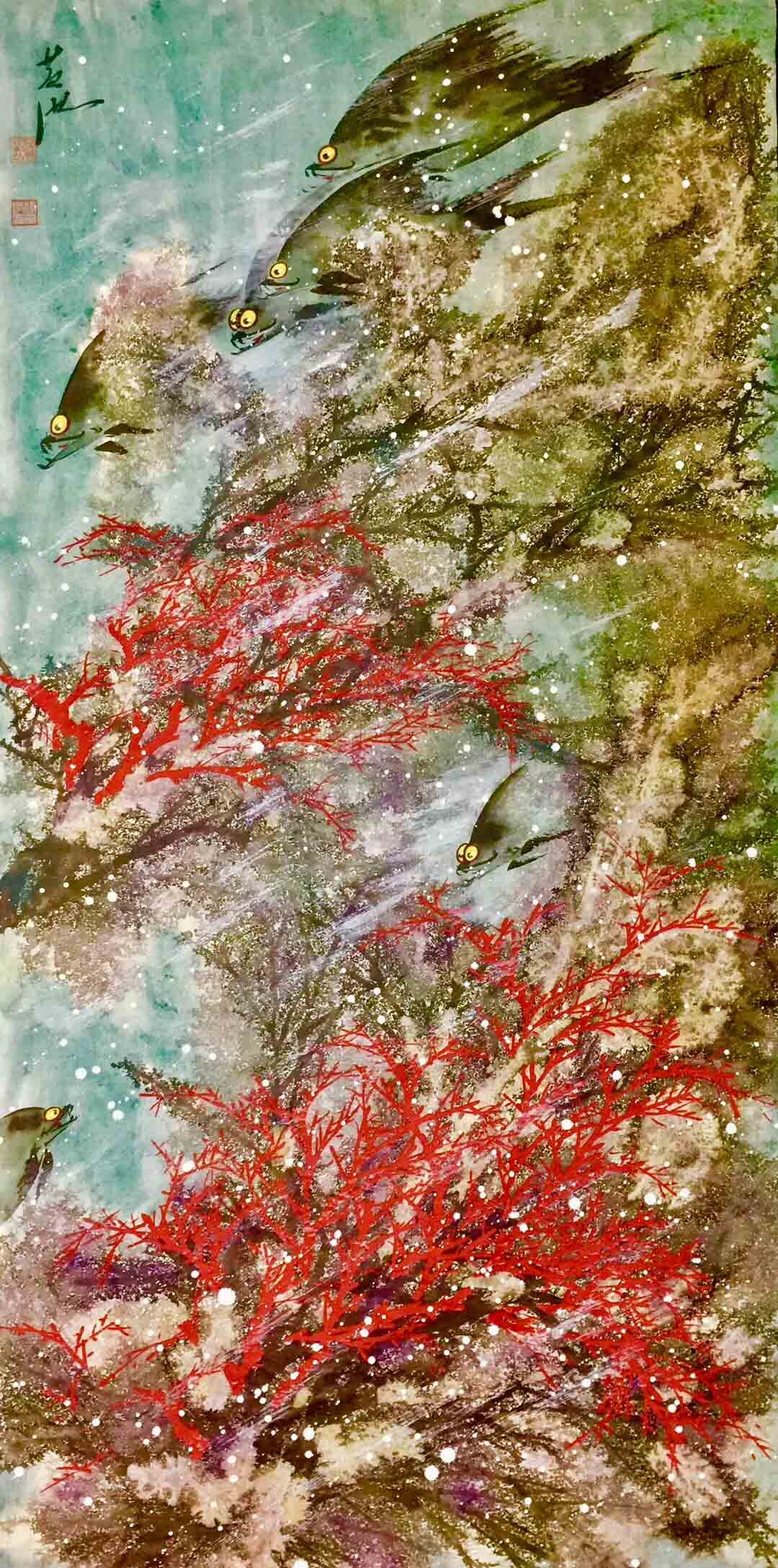 藝術源於生活,藝術源於天賦,要在藝術殿堂裡獨樹一幟,這兩者缺一不可,謝黃洪出生在福建東山,是一個在海濤聲中出生,在潮汐中成長的弄潮兒。他用神奇的畫筆,描繪出靈動旖旎的海藻,千姿百態的遊魚,繁枝叢生的珊瑚其色彩斑斕的渲染,猶如火山濺發,力透紙背,其簡繁得體的構圖,宛如乾坤變幻,以小見大,畫面靜中有動,虛中有實,陰陽變幻,耐人尋味,難怪他的作品在法國盧浮宮和日本的展出時,受到西方行家的高度讚美,在日本展出時,受到粉絲們的追捧,這種認可,再一次驗證,繪畫是人類共同的語言,是心靈溝通的共振頻率,猶如中國二胡和西方提琴,故宮大殿和羅馬穹頂,日本鳥居和中國牌樓無分中西,同為人類所擁有的藝術財富。