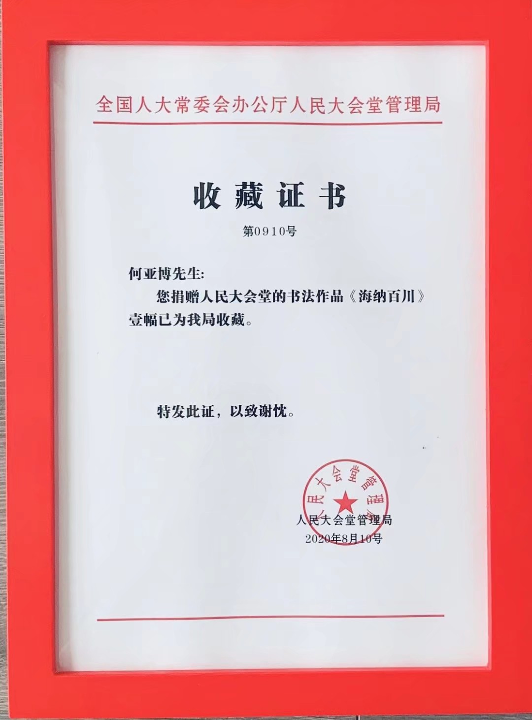 何亚博,中国毛体书法家协会会员,中国文化艺术研究会会员,中国华夏万里行画家协会会员,书法作品《海纳百川》被人民大会堂管理局收藏。