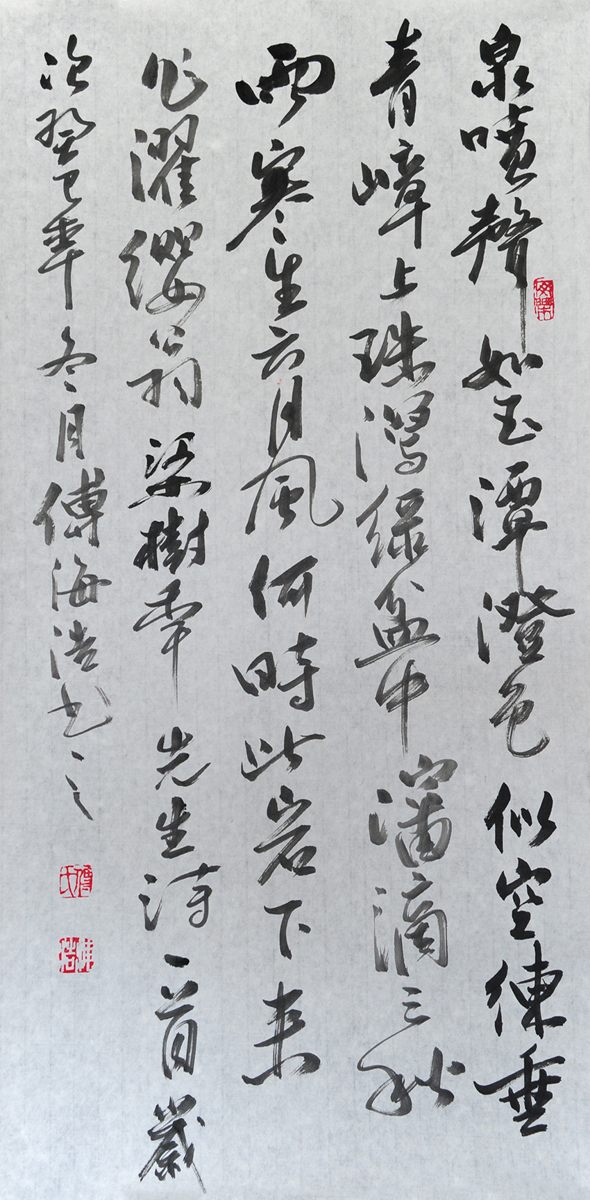 傅海浩(身份证名:付海浩),幼承教诲,从祖父傅文清先生学习书法。1982年先后从王淑华、李秀珍2位老师描红、拓仿软笔书法。1984年参加伊聚元老师举办的书法小组。1986年师从李宝山老师学习柳体书法、水粉画和素描。1989年—1992年。考入顺义师范美术班,受教于田兆丰、辛加峰、张维敬、刘宗宝、吴广惠诸先生。学习国画、水粉、素描、书法和篆刻。1992.07—1996.07 顺义区尹家府中小美术教师。